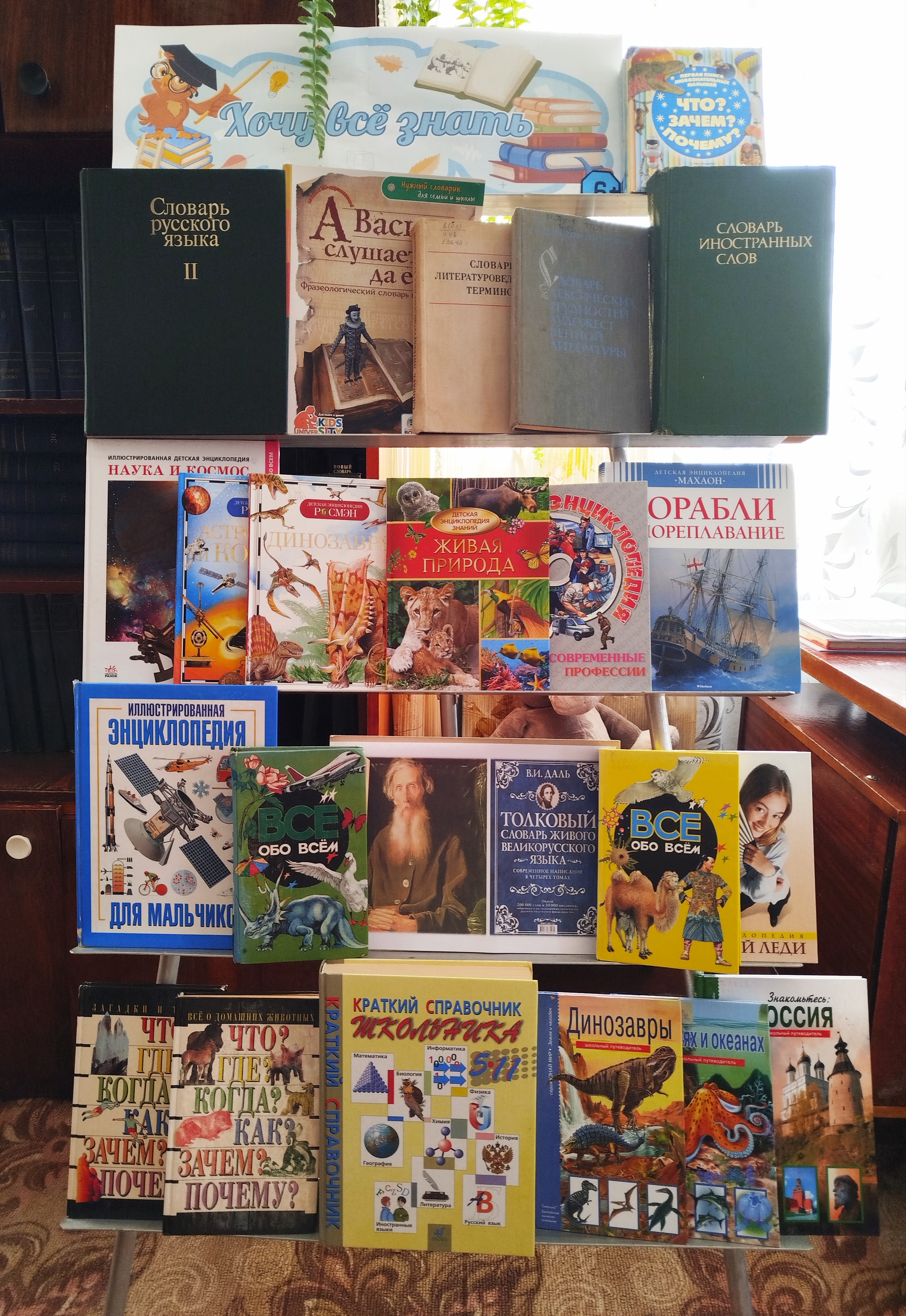С самого начала мероприятия дети окунулись в атмосферу открытий. Перед ними предстала специально подготовленная выставка справочной литературы «Хочу все знать!». Здесь были представлены самые разнообразные словари: толковые, орфографические, фразеологические, словари иностранных слов, а также энциклопедии и справочники – универсальные и тематические, охватывающие самые разные области знаний.