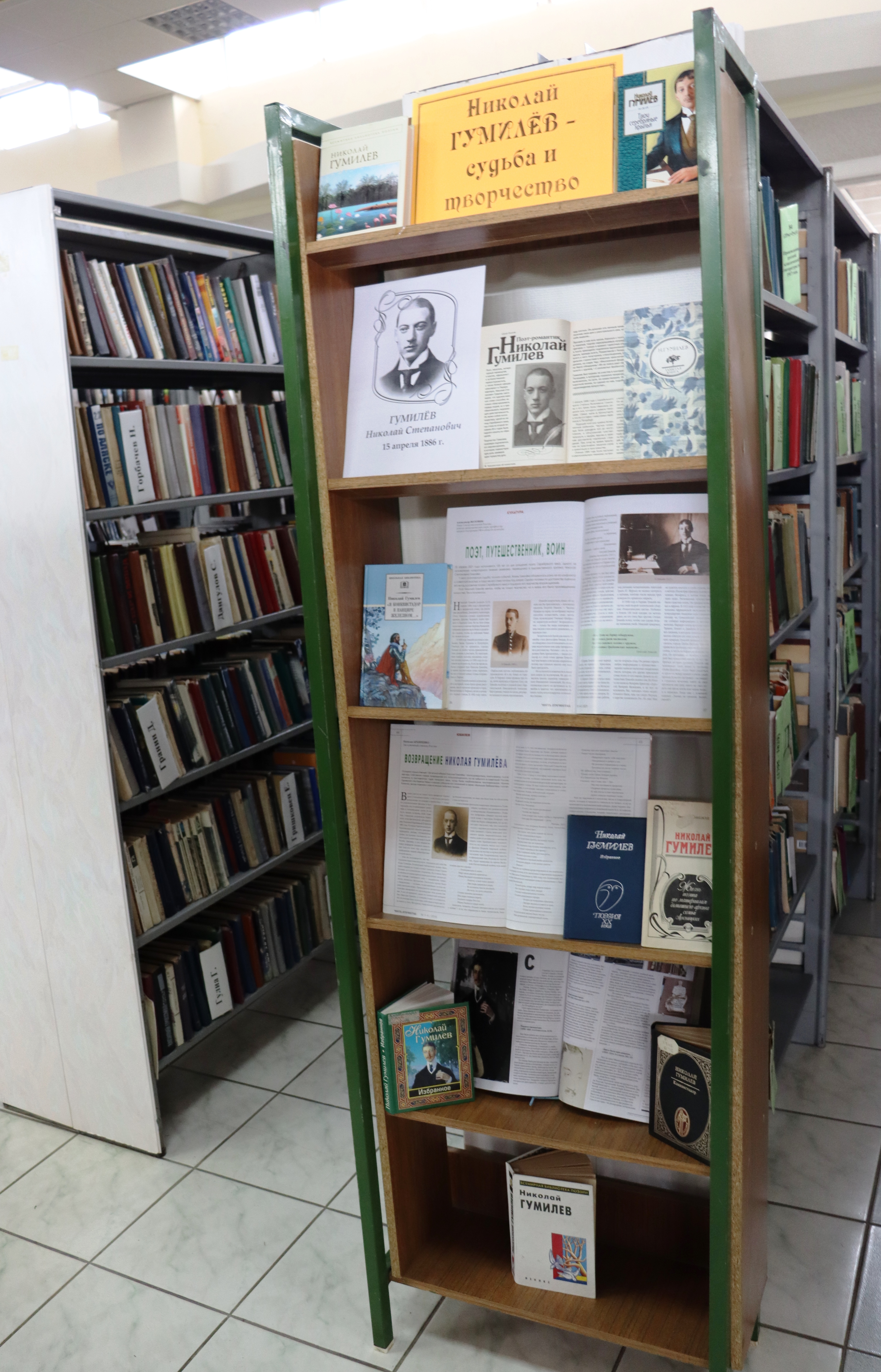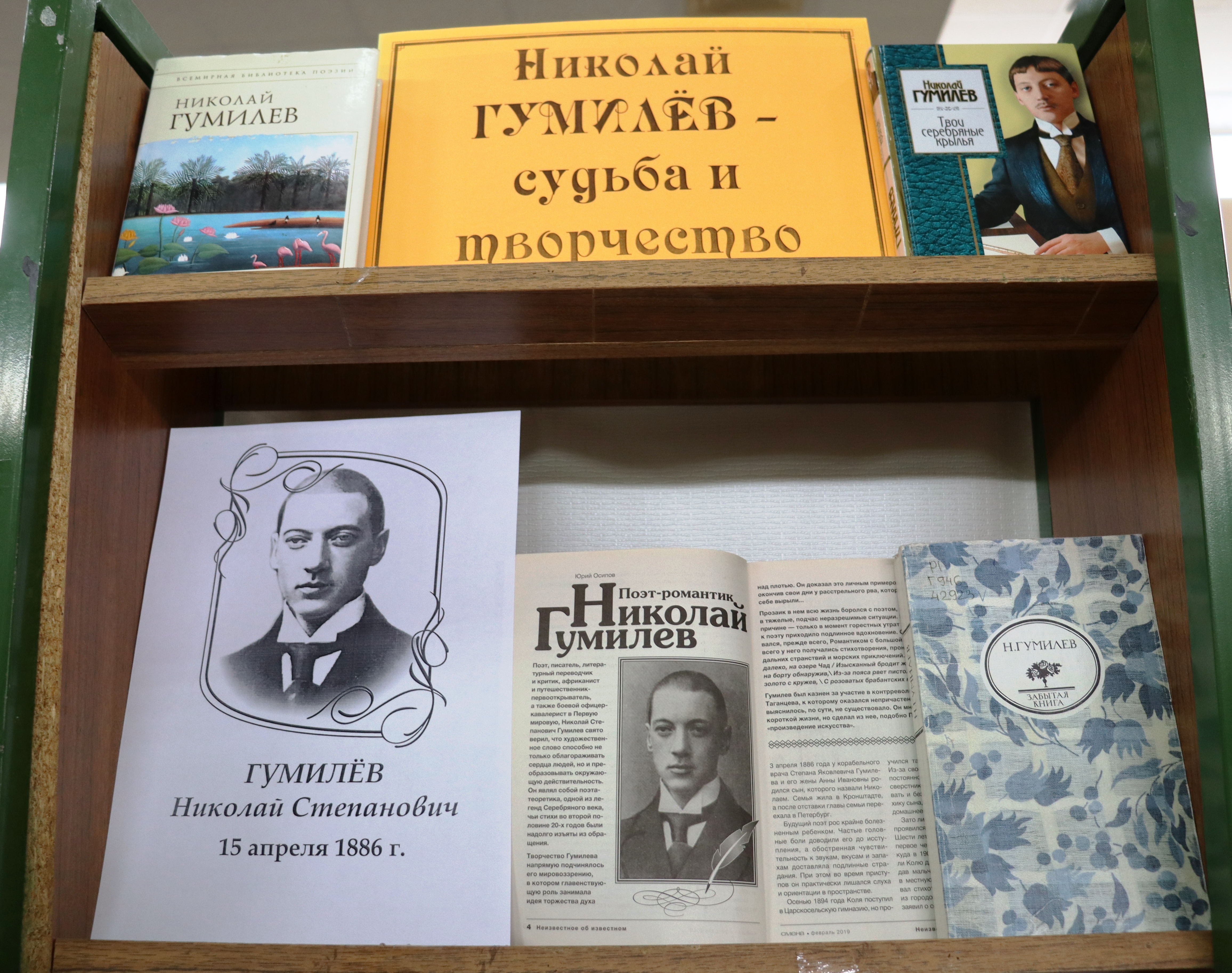 С 1 по 30 апреля в Центральной районной библиотеке действует выставка-юбилей «Николай Гумилев - судьба и творчество», посвященная 140-летию со дня рождения выдающегося поэта.