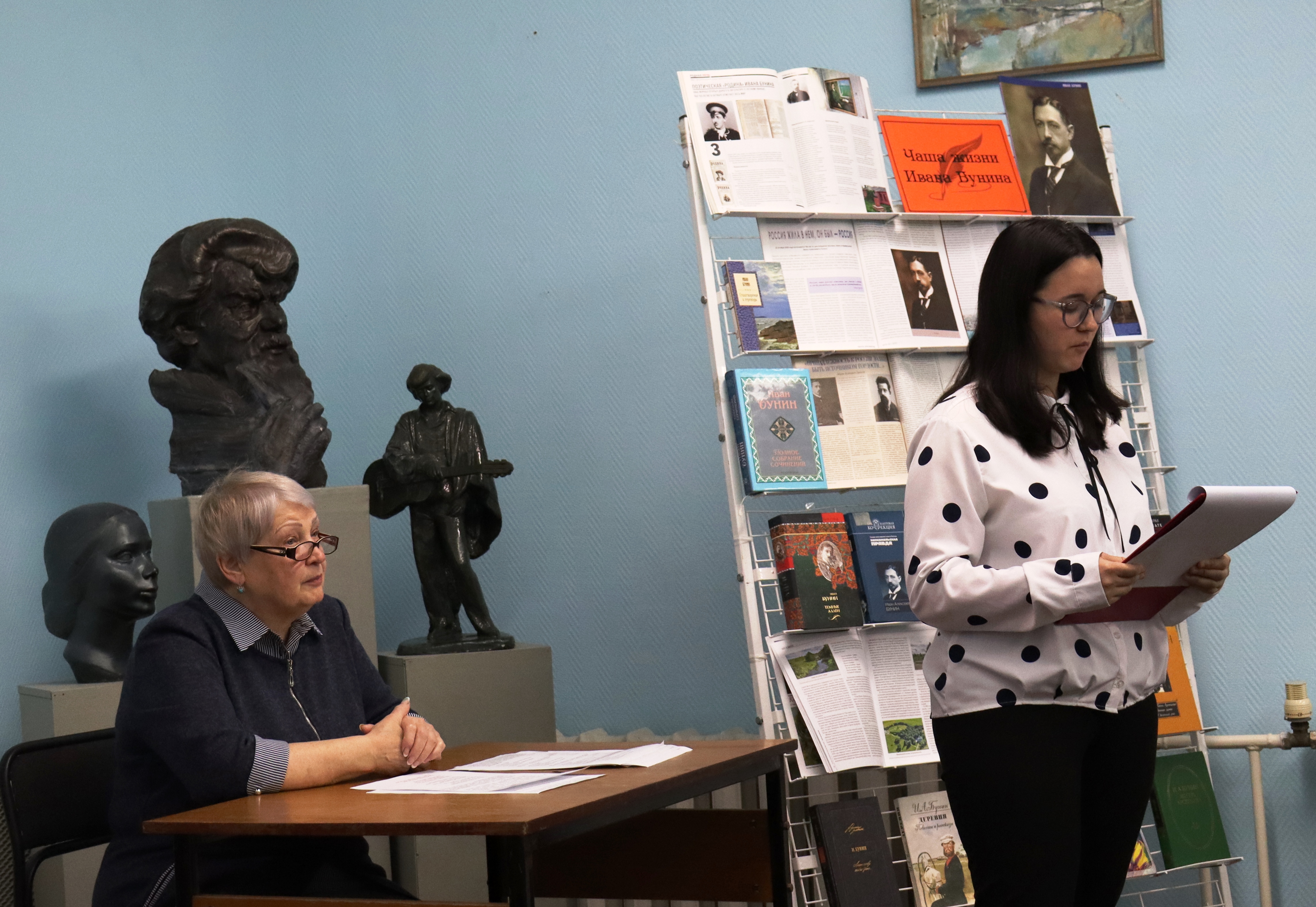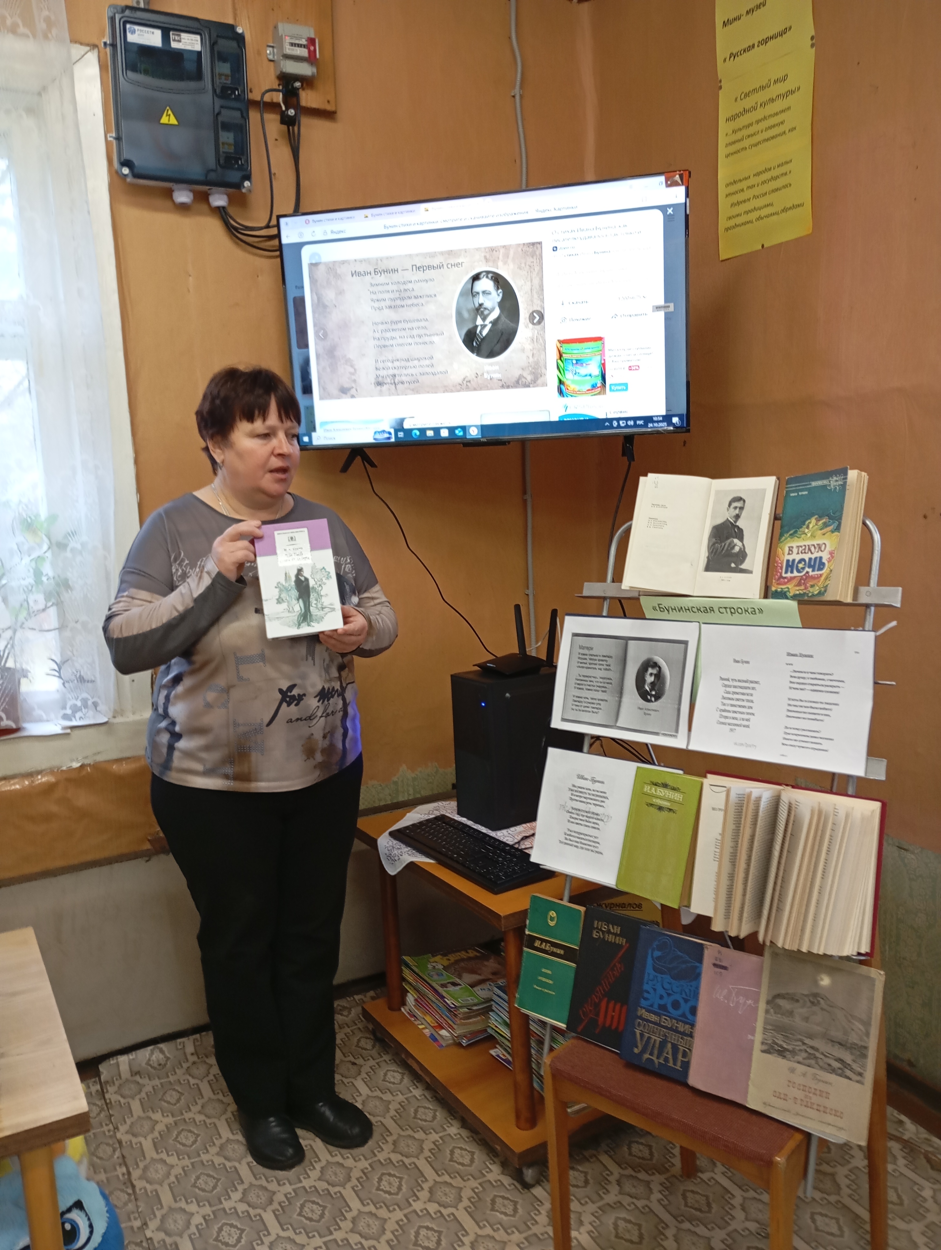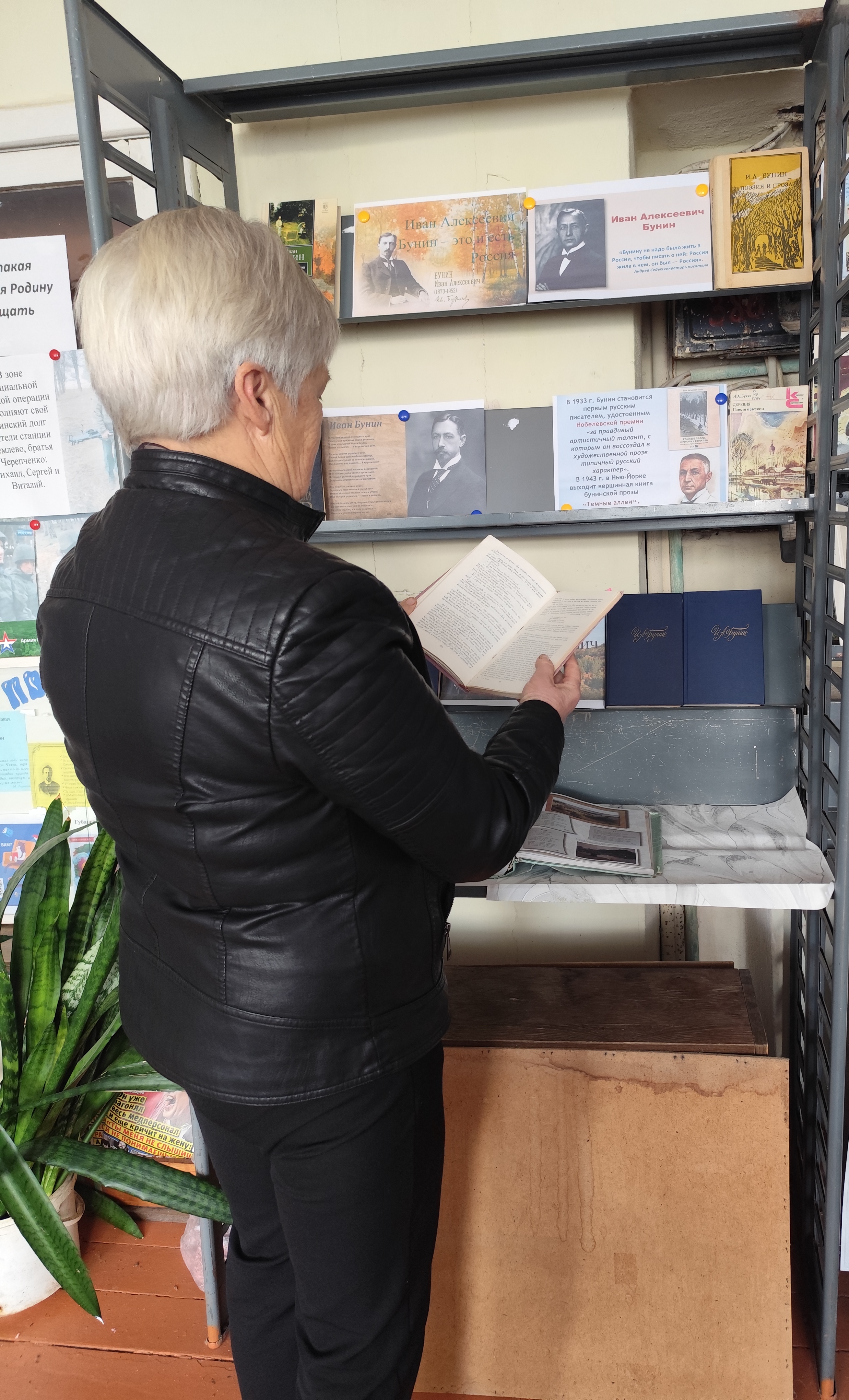 Библиотечный работник познакомила с книжной выставкой «Бунинская строка!», где представлена литература из фонда библиотеки, повествующая о жизни и творчестве Ивана Алексеевича, а также сборники художественных произведений.