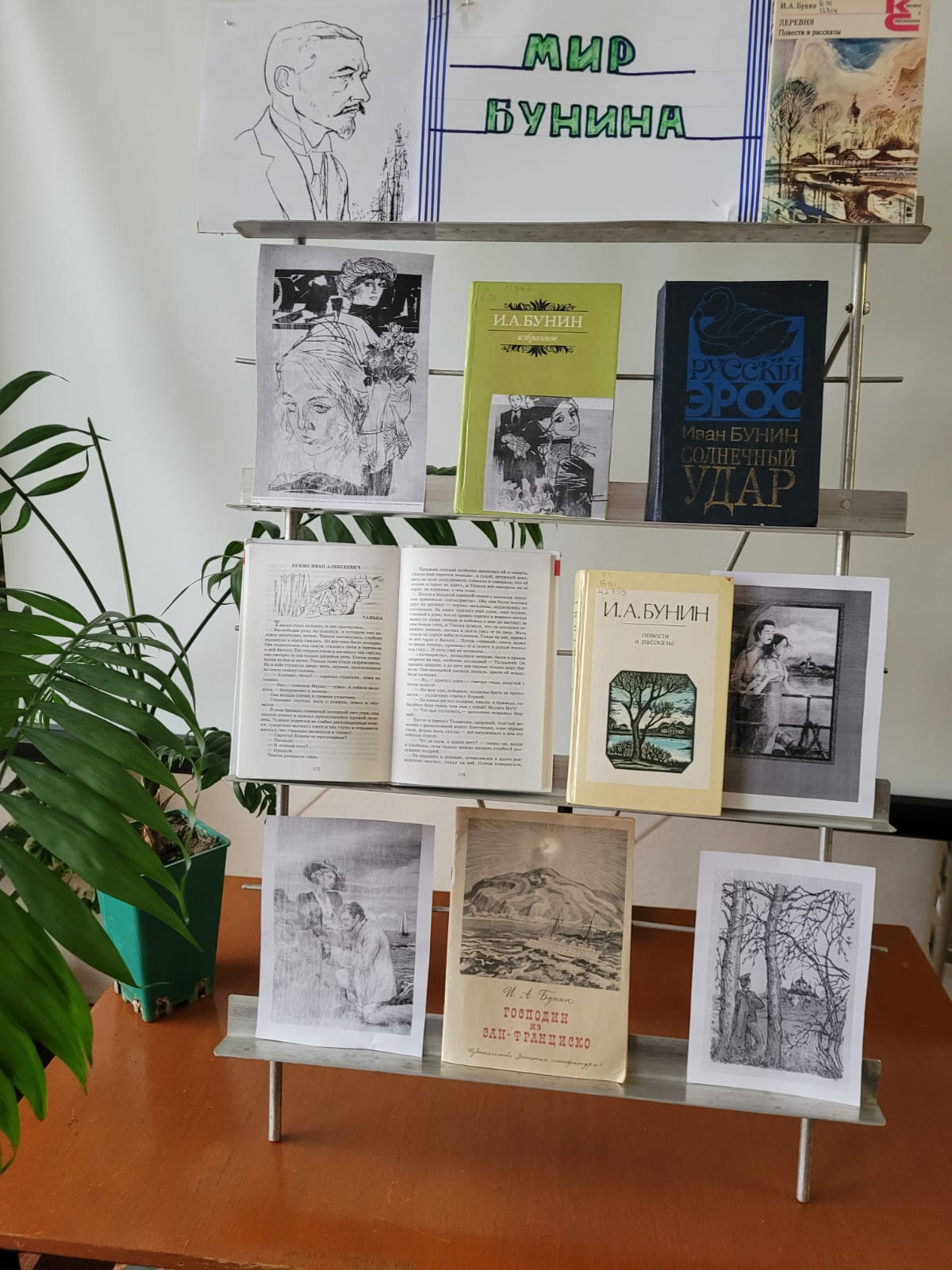 22 октября в Степаниковской сельской библиотеке №29 оформлена выставка – просмотр "Мир Бунина", которая знакомит с жизнью и литературным наследием писателя. Вниманию читателей представлены книги, «Повести и рассказы», «Деревня», «Господин из Сан-Франциско», «Солнечный удар», «Избранное», «Антоновские яблоки» и другие.