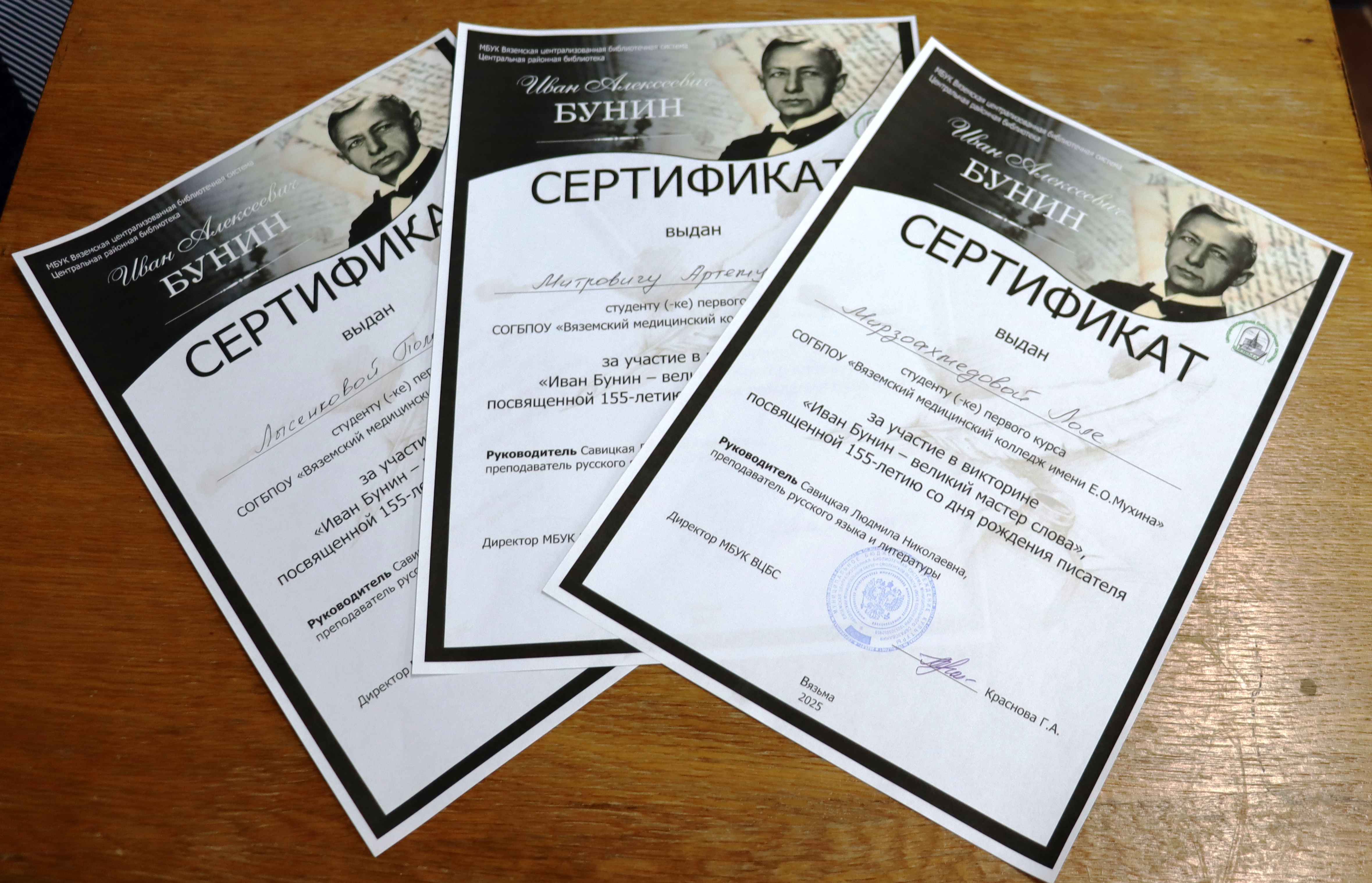 11 ноября в Центральной районной библиотеке состоялось мероприятие, посвященное 155-летию со дня рождения Ивана Алексеевича Бунина. Литературный час «Я жил лишь затем, чтобы писать» посетили учащиеся первого курса СОГБПОУ «Вяземский медицинский колледж имени Е.О. Мухина», сопровождаемые руководителем Людмилой Николаевной Савицкой.