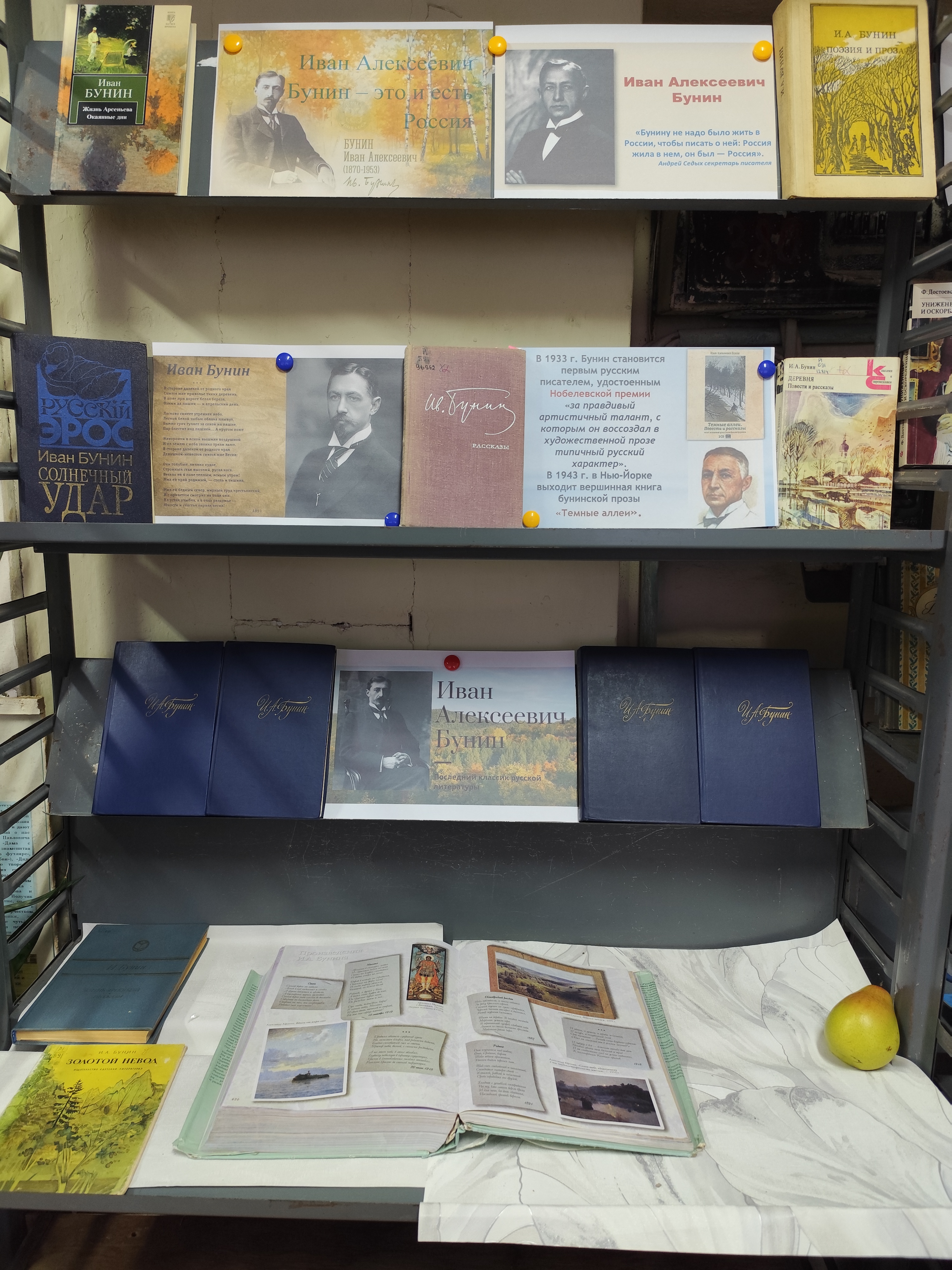 В Семлёвской сельской библиотеке №28 организована выставка, посвящённая творчеству великого классика русской литературы XX века Ивана Алексеевича Бунина. Название выставки звучит символично: «Иван Алексеевич Бунин — это и есть Россия». Оно подчёркивает глубокую связь творчества Бунина с историей, культурой и духом нашей Родины.