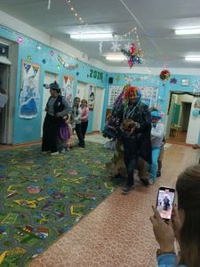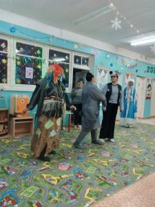 С самого начала представления сказочные герои Волк и заяц увлекли детей в волшебный мир сказки и волшебства. Библиотекарь перевоплотилась в самую настоящую Бабу Ягу и решила немножко подшутить над ребятами. Она так ловко поменяла все указатели, что Дедушка Мороз никак не мог найти дорогу к ребятам. Но герои, Волк и Заяц, и Снегурочка, не растерялись, не дали празднику сорваться! Волк и Заяц так ловко справлялись со всеми заданиями и веселили ребятню, что даже Баба Яга не смогла устоять и присоединилась к веселью!