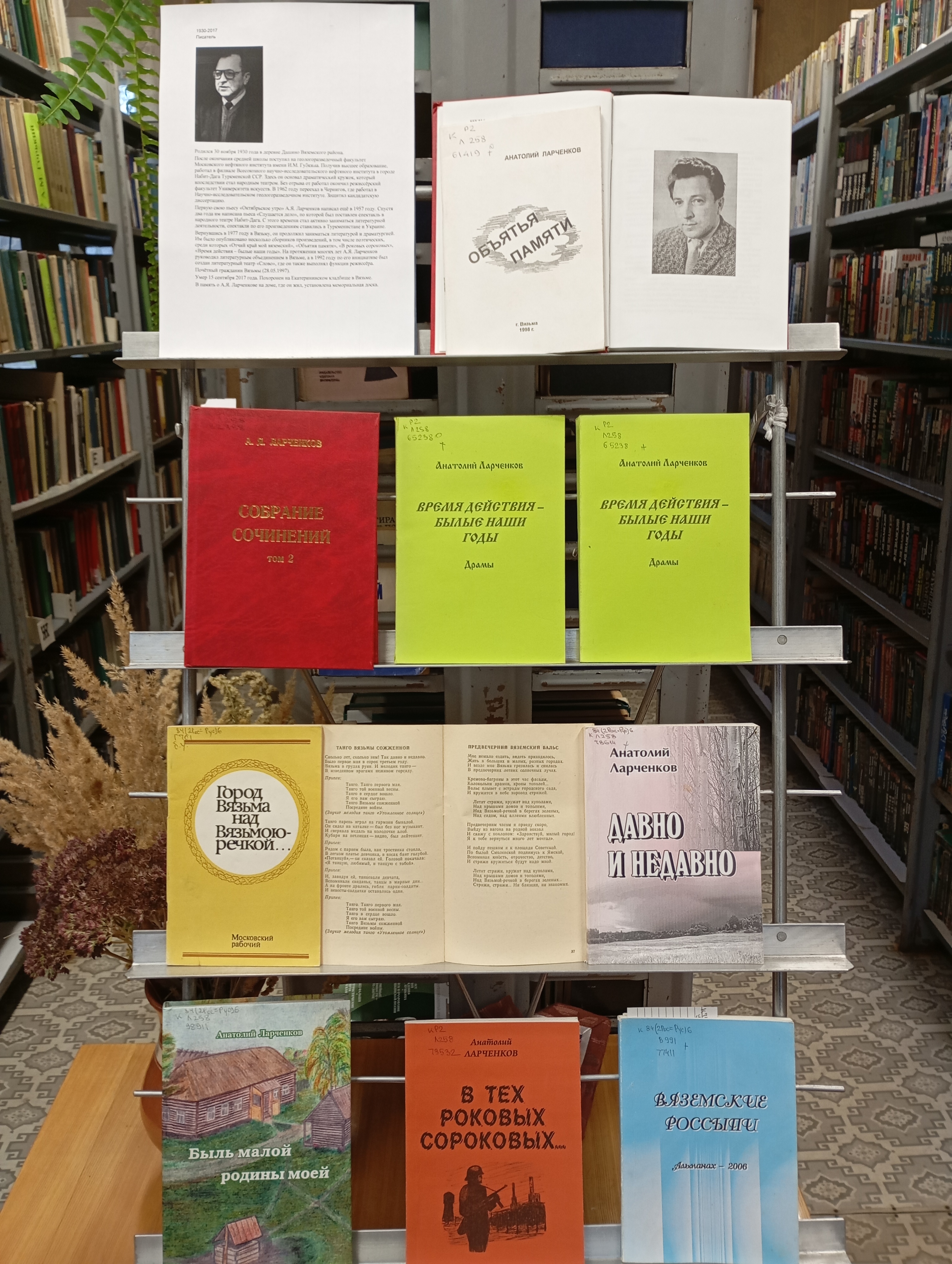 На выставке «Сын земли Смоленской», читатель сможет ознакомиться с творчеством Анатолия Яковлевича через его книги: «Быль малой родины» –судьбах простых людей, которые составляют основу нашей истории; «Время действия – былые наши годы» – сборник, который перенесет в те времена, когда формировались характеры, рождались мечты и строилось будущее; «Стихотворение Поэтическая Вязьма» – лирическая сторона таланта Анатолия Ларченкова, его любовь к родному краю, выраженную в поэтических строках.