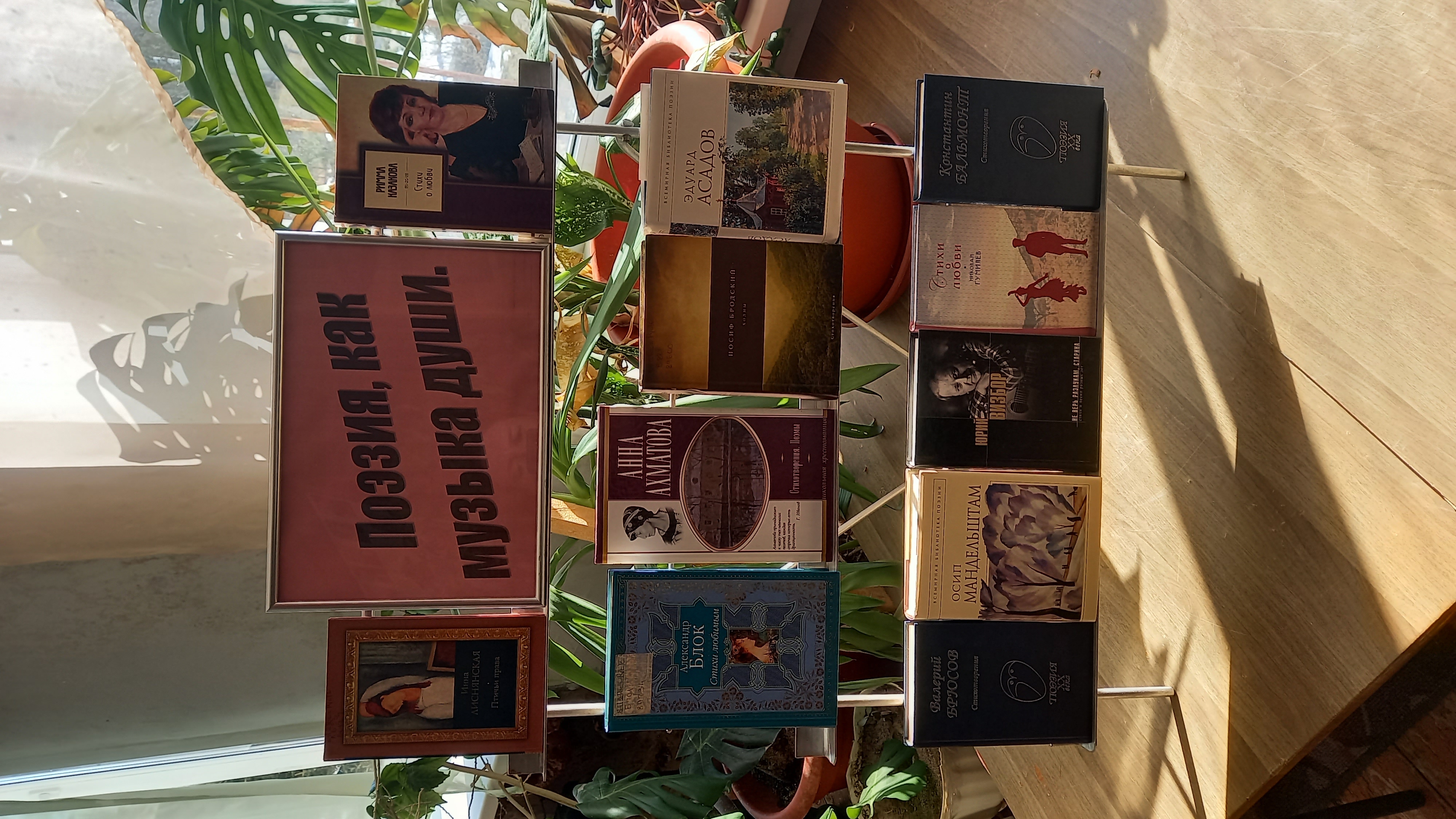 На выставке представлены поэтические сборники великих поэтов прошлого и современности, которые позволят вновь прикоснуться к чарующим силам поэтического дара поэтов всех времен таких как: Э. Асадов, К. Бальмонт, А. Дементьев и другие поэты.