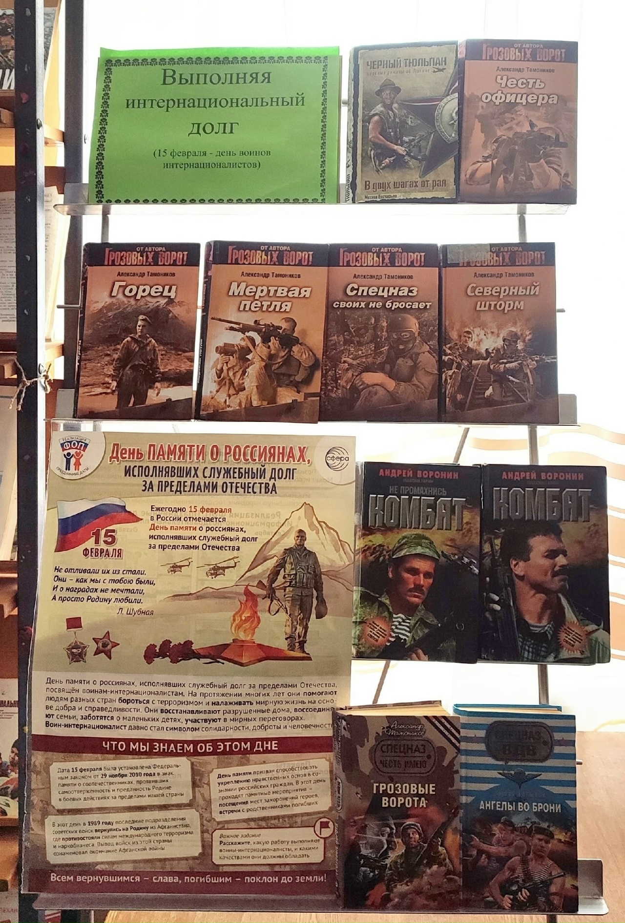 12 февраля в городской библиотеке №4 (поселка «Юбилейный») сотрудник библиотеки, совместно с советником директора по воспитательной работе А. В. Дубнярской, для обучающихся МБОУ СОШ № 7 провели час мужества «Во имя Родины и долга», посвященный Дню памяти воинов-интернационалистов.