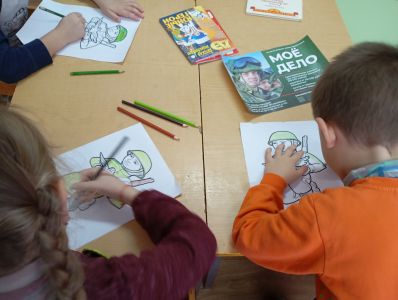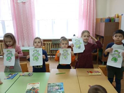 Дошкольники участвовали в физкультминутке "Будем мир мы защищать!", "Наша армия сильна, нашей армии "Ура!", затем старательно раскрашивали раскраску "Русский солдат".