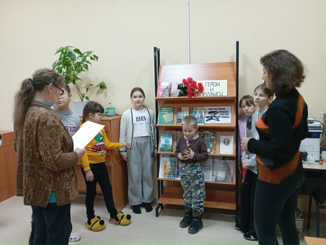 Библиотечный работник рассказала о празднике, что во все времена люди гордились и прославляли, любили и берегли свою Родину, своё Отечество и защищали её от врагов - таких людей называли героями! Познакомила с героями прошлого времени: былинными богатырями, которые защищали свою землю от врагов, с юными героями Великой Отечественной войны, и с героями которые защищают своё Отечество - сегодня.