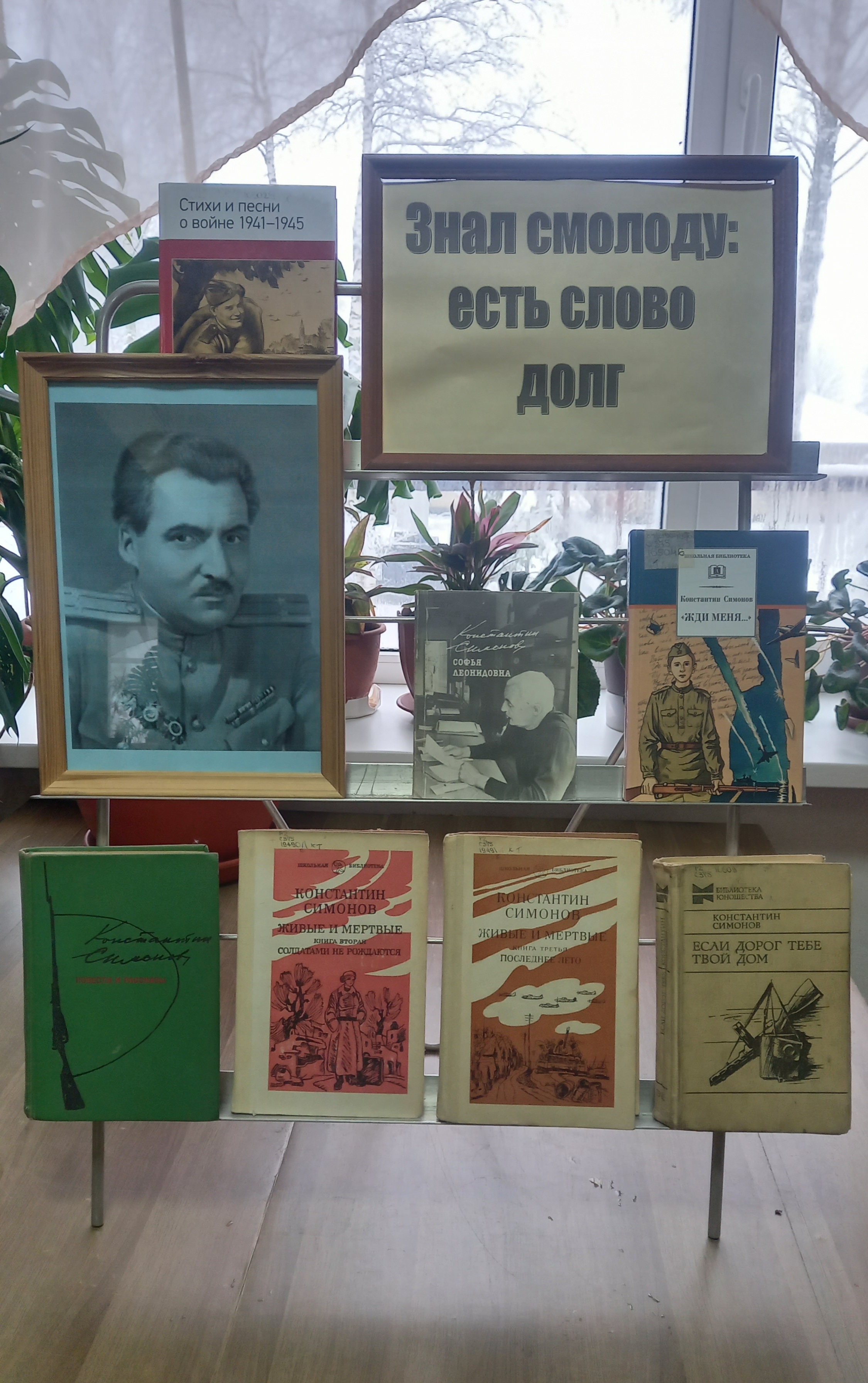 24 ноября в Относовской сельской библиотеке №25 открылась выставка-портрет «Знал смолоду: есть слово долг», посвященная 110-летию со дня рождения Константина Симонова - поэта и писателя.