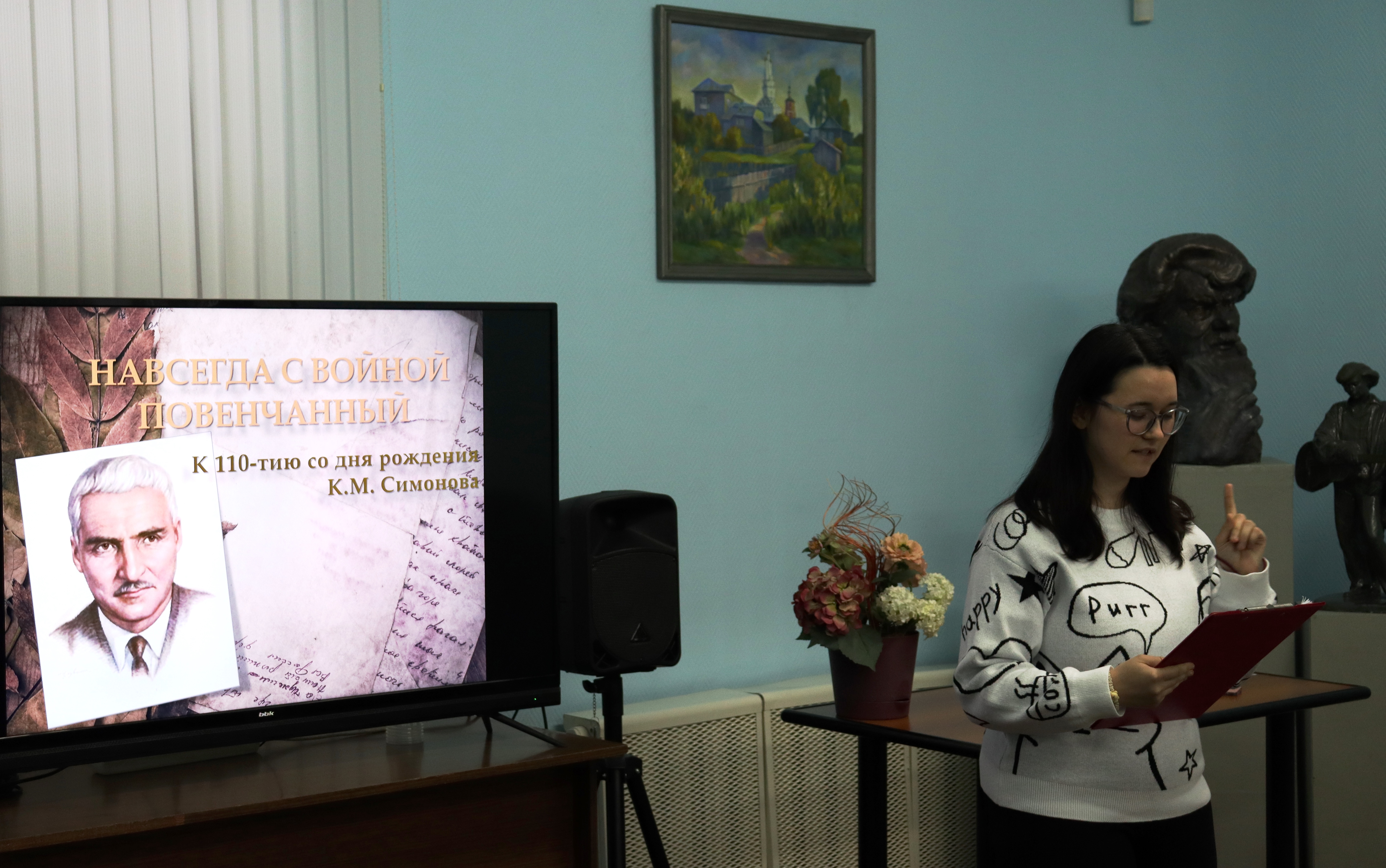 25 ноября в городской библиотеке №4 (поселка «Юбилейный») в рамках программы «Пушкинская карта» проведен краеведческий экскурс «Вяземский край: история и культура», приуроченный к 110-летию со дня рождения Константина Михайловича Симонова и посвящённый связи писателя с городом Вязьмой.