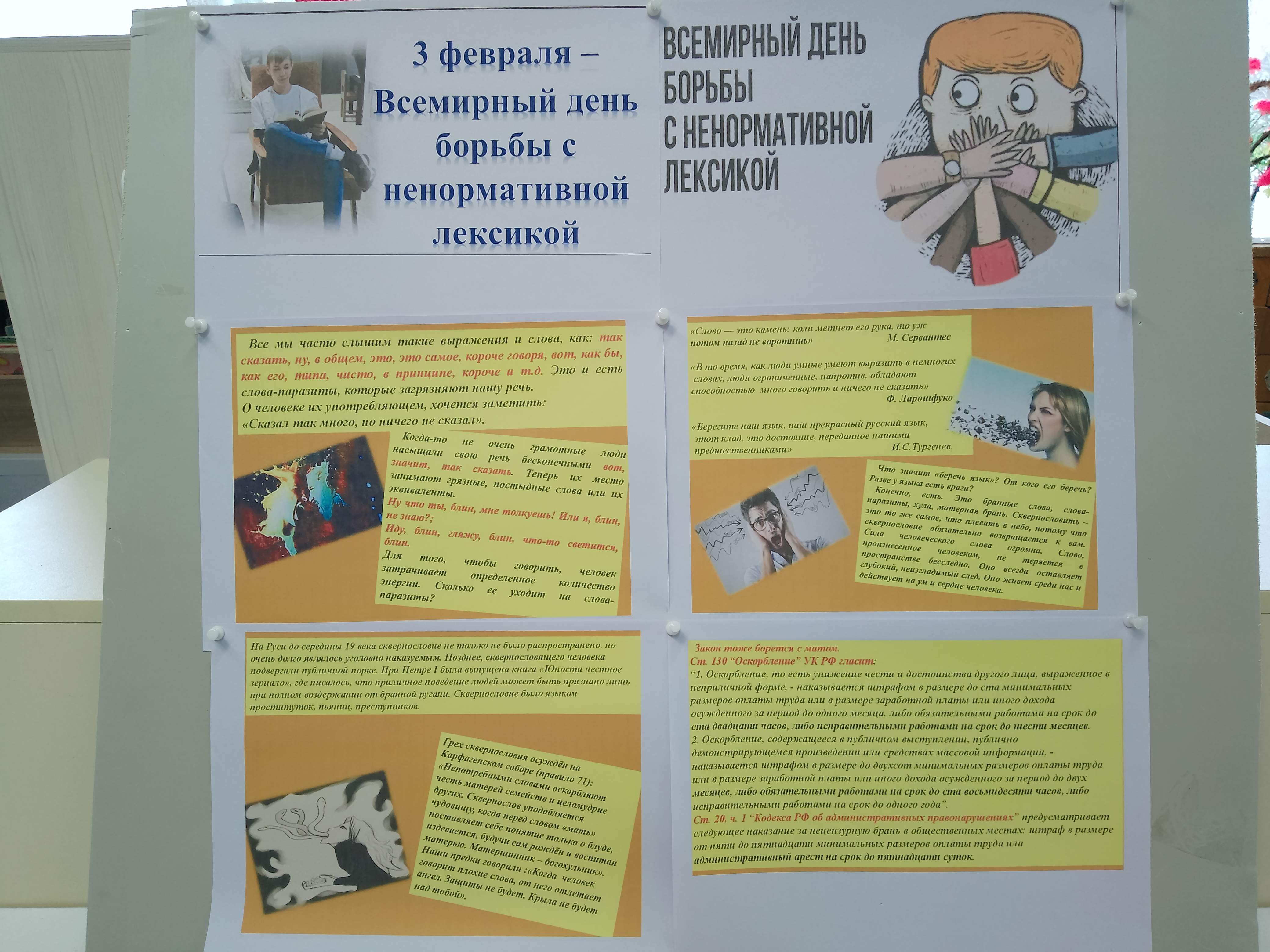 5 февраля в Центральной библиотеке прошла тематическая беседа «Скажем "НЕТ" сквернословию!», приуроченная к Всемирному Дню борьбы с ненормативной лексикой. На мероприятие были приглашены учащиеся МБОУ СОШ №4.