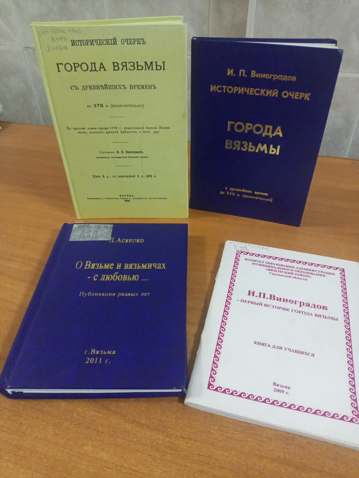 В 2025 году исполнилось 135 лет со дня выхода в свет книги Ивана Павловича Виноградова «Исторический очерк города Вязьмы с древнейших времен до XVII века (включительно). С прил. плана города 1779 г., родословной кн. Вяземских, описания древней крепости и мног. друг.» – ценнейшего источника по истории Вязьмы. Книга первого историка и краеведа Вязьмы была опубликована в 1890 году в Москве.